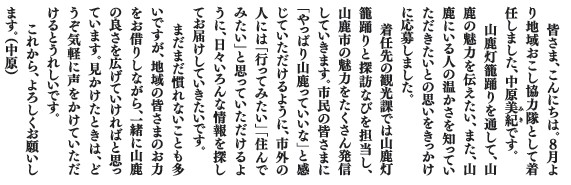 くらし 地域おこし協力隊通信 26/29 前の記事 次の記事 発行日 : 2025年11月01日 自治体名 : 熊本県山鹿市 広報紙名 : 広報やまが 令和7年11月号 ■観光振興 ◇ごあいさつ →次号は周隊員 問合せ:観光課 【電話】43-1579 Tweet シェアする 就職でお悩みの人はご相談を! あとがき
