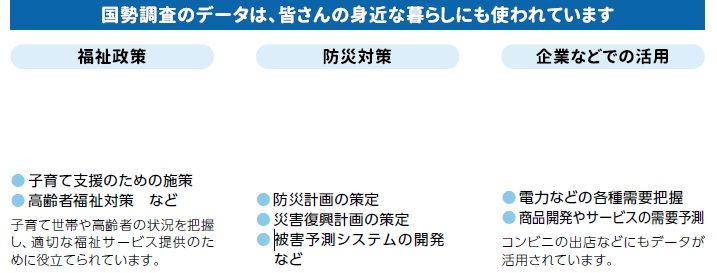 国勢調査は「統計法」に基づく基幹統計調査です。統計調査員や調査関係者が、調査で知り得た内容を他に漏らしたり、統計以外の目的で使用したりすることは絶対にありません。これらの行為は、統計法という法律で固く禁じられており、違反した者に対する罰則も設けられています。