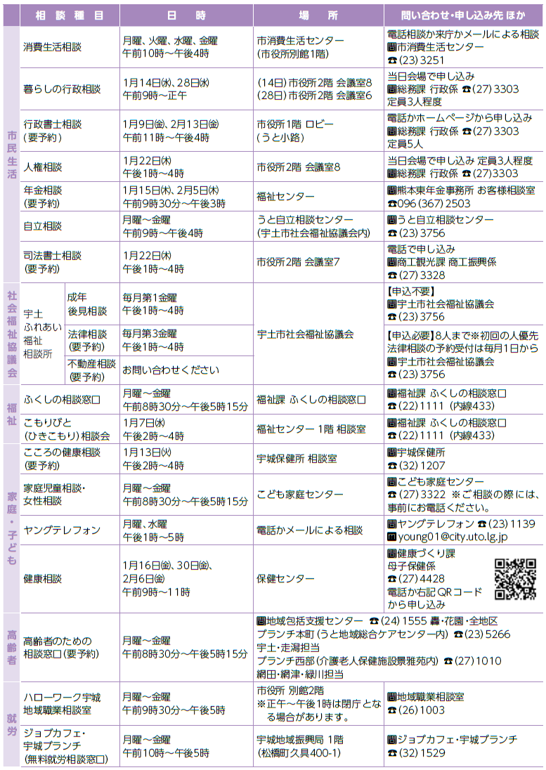 くらし くらしの無料相談窓口 26/39 前の記事 次の記事 発行日 : 2026年01月01日 自治体名 : 熊本県宇土市 広報紙名 : 広報うと 令和8年1月号 相談する前には、各問い合わせ先への確認をお願いします。全ての相談日は年末年始・祝日を除きます。 Tweet シェアする 消費者トラブル注意報 広告と異なる商品が届くネット通販に注意 うとのできごと(1)