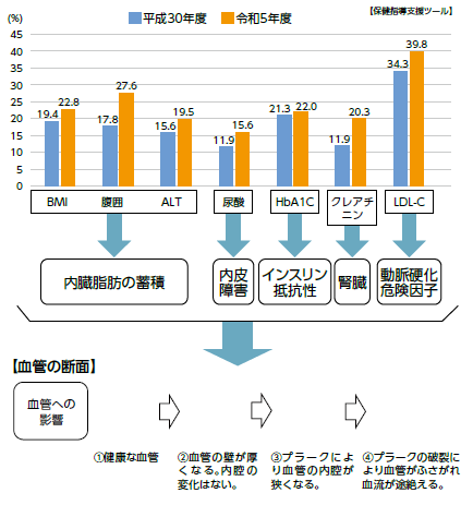 宇土市では、国民健康保健加入者を対象に若年者健診(30代)を実施しています。令和5年度の結果をみてみると、肥満傾向のある者や生活習慣病の因子を持つ人が、平成30年度と比較して増加し、メタボリックシンドロームへの影響が、健診結果に表れています。