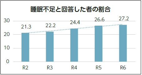 健康寿命とは、健康上の問題で日常生活に制限のない期間がどの程度あるかを示す指標で、平均寿命と健康寿命との差は日常生活に支障のある「不健康な期間」を意味します。みなさん!日常生活に気を付けて、すこやかな毎日を送りませんか?宇土市では、国民健康保険加入者の人を対象に特定健診を実施しています。その中で、睡眠不足だと回答した人の割合は、年々増加傾向にあります。そこで!今回は、良い睡眠についてお話したいと思います。