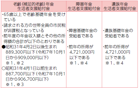 ※3 前年の公的年金等の収入金額とその他の所得との合計額が787,700円を超え887,700円以下(令和7年10月1日から906,700円以下)の場合は、「補足的老齢年金生活者支援給付金」を支給。