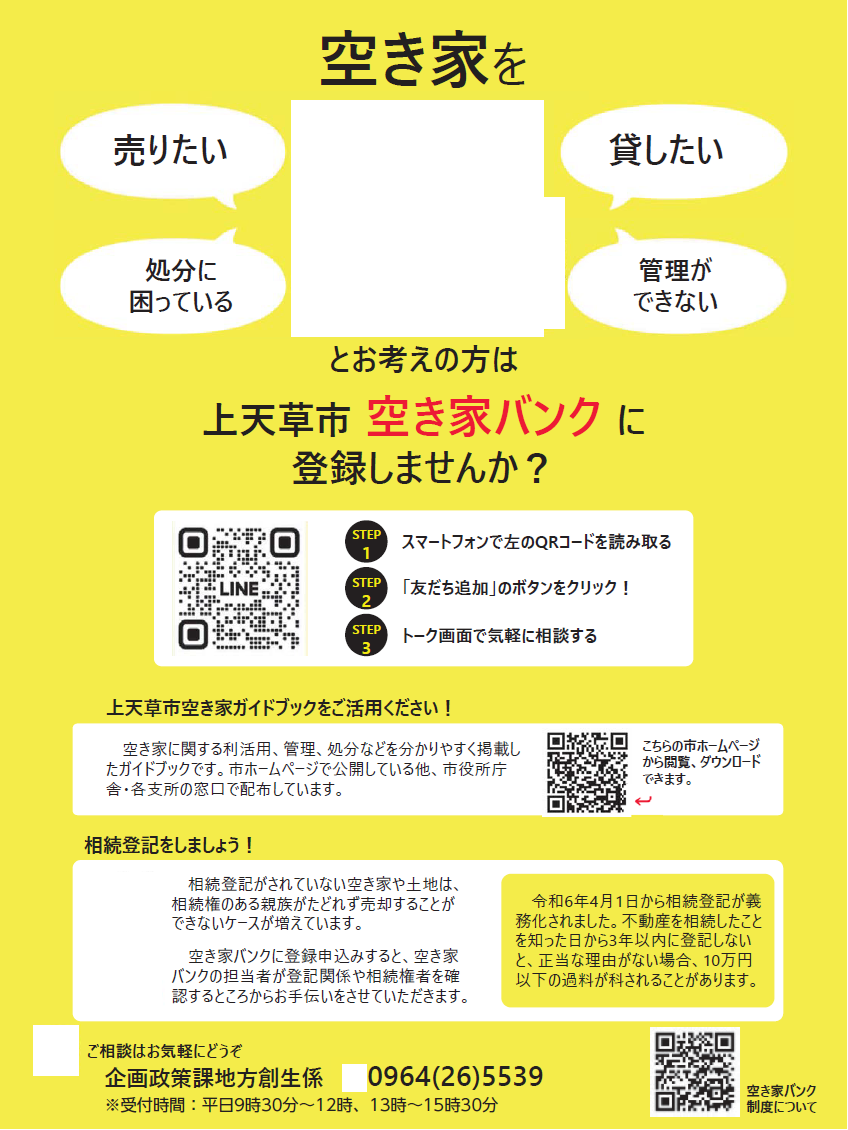 くらし 上天草市空き家バンクに登録しませんか? 31/44 前の記事 次の記事 発行日 : 2026年01月15日 自治体名 : 熊本県上天草市 広報紙名 : 広報上天草 令和8年1月号 Tweet シェアする お知らせinformation【その他】(2) シリーズJINKEN