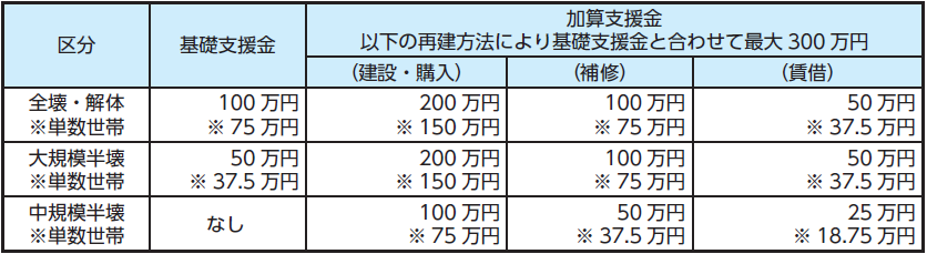 ▽支援金額一覧表 ※単数世帯(被災時世帯の人数が1人)の場合は、4分の3の金額が支給されます。