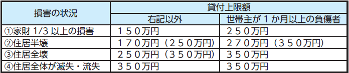 貸付上限額:世帯主の負傷、家財や住居の損害に応じて150万円~350万円