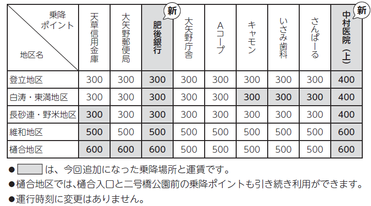 10月1日(水)から、大矢野地域の乗合タクシーは、目的地となる乗降ポイントを以下のとおり改正します。