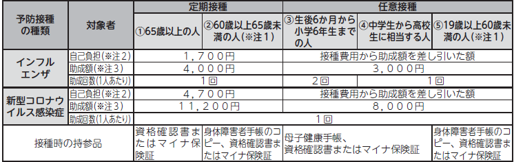 65歳以上の人などを対象に、インフルエンザ予防接種および新型コロナウイルス感染症予防接種にかかる費用を一部助成します。希望される人は、事前に医療機関へ予約をし、体調の良いときに接種してください。