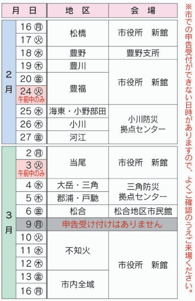 待ち時間短縮のため、できるだけお住まいの地区の日程・会場での申告にご協力をお願いします。