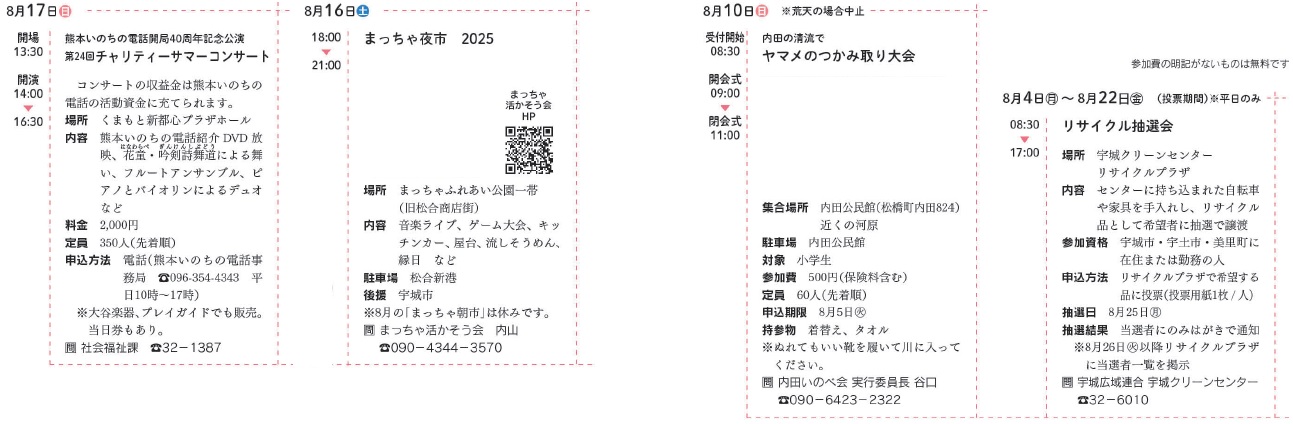 イベント UKIで楽しむ・UKIを楽しむ おでかけガイド 29/39 前の記事 次の記事 発行日 : 2025年08月01日 自治体名 : 熊本県宇城市 広報紙名 : 広報うき ウキカラ 令和7年8月号 Tweet シェアする あなたのくらしにピタッと 月刊 宇城通信 -みんなの掲示板- 豊野町ふるさと祭り