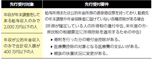 申告会場来場者の待機時間短縮、混雑・密集を緩和するため、次の要件を満たす人は先行して申告を受け付けます。