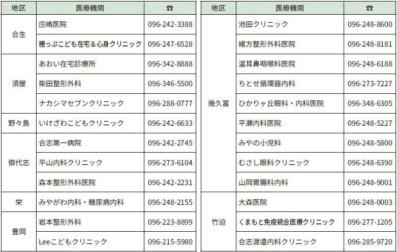 下記の市内委託医療機関以外に、菊池市、菊陽町、大津町にも委託医療機関があります。年齢制限や予約が必要な医療機関がありますので、詳しくは市ホームページをご覧になるか、市へお尋ねください。