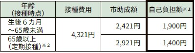 ※2 60歳以上65歳未満(接種時点)で、心臓、腎臓または呼吸器の機能に自己の身辺の日常生活活動が極度に制限される程度の障がいがある人およびヒト免疫不全ウイルスにより免疫の機能に日常生活がほとんど不可能な程度の障がいがある人(身体障害者手帳1級相当の人)は、定期接種となるため自己負担額は65歳以上の額になります