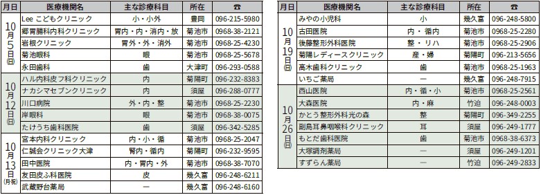 くらし 休日在宅医/休日開局薬局 24/36 前の記事 次の記事 発行日 : 2025年09月20日 自治体名 : 熊本県合志市 広報紙名 : 広報こうし 令和7年10月号 第235号 ※変更になる場合もあります。最新情報は、下記へお問い合わせください(24時間対応) ※受診するときは各医療機関に電話でご確認ください 問い合わせ:菊池郡市医師会テレホンサービス 【電話】0968-25-3300 Tweet シェアする 児童館だより 図書館だより