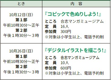 くらし マンガを読もう!観よう!! 学ぼう!!! 合志マンガミュージアムだより 26/36 前の記事 次の記事 発行日 : 2025年09月20日 自治体名 : 熊本県合志市 広報紙名 : 広報こうし 令和7年10月号 第235号 ■ワークショップ ※予約は9月25日(金)からです 申し込み・問い合わせ:合志マンガミュージアム 【電話】096-273-6766 ※休館日は、27ページのお知らせカレンダーをご覧ください ※新入荷本情報、各イベントについて詳しくは当館ホームページをご覧ください Tweet シェアする 図書館だより 警察署だより