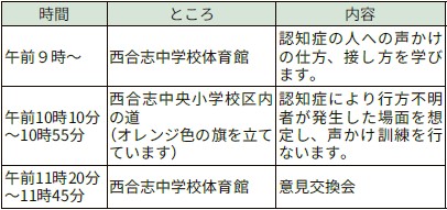 認知症により行方不明者が発生した場面を想定し、地域の皆さんが声のかけ方や、通報の仕方を学ぶ訓練です。ご家族や近所の皆さんと一緒に、ぜひご参加ください。