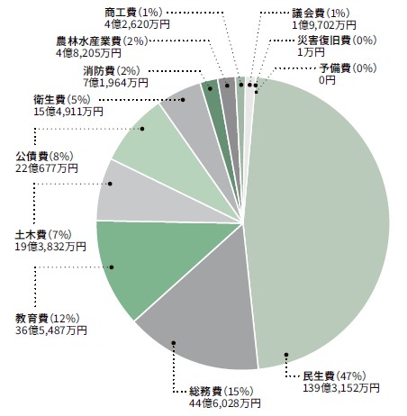 総額は前年度と比べ、21億1,857万7千円増加しています。増加の主な要因は、総務費が15億7,368万8千円増加しており、定額減税補足給付金(6億996万円)が主な要因です。次に、民生費が2億2,621万4千円増加しており、児童手当(2億2,585万円)が主な要因です。