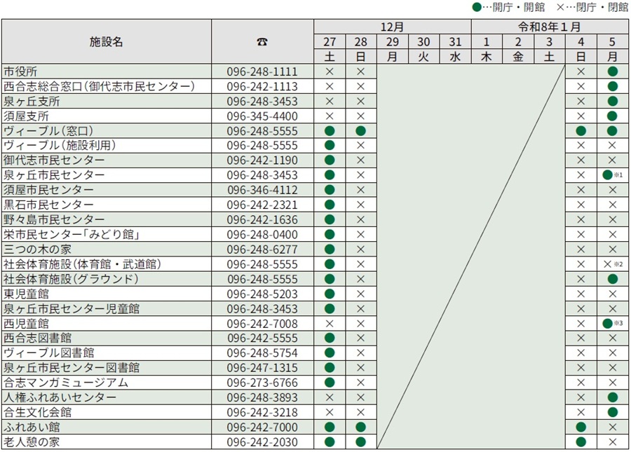 くらし 市役所・各施設の年末年始の閉庁日・休館日 16/39 前の記事 次の記事 発行日 : 2025年11月20日 自治体名 : 熊本県合志市 広報紙名 : 広報こうし 令和7年12月号 第237号 ※1 受け付けのみ ※2 武道館は開館 ※3 午前10時から開館 Tweet シェアする ヴィーブルandコミュニティ情報 年末年始のパスポート申請はお早めに