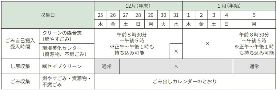 年末年始のごみ収集とし尿収集は下記の日程表のとおり行ないます。