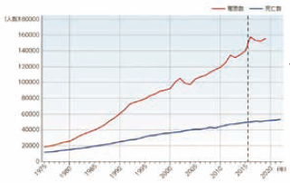・大腸がんの罹患数・死亡数の推移(男女計)