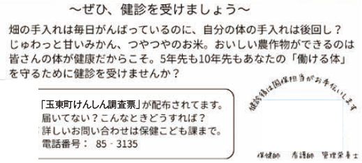 健康 国保加入の皆さん、畑の手入れは毎日、体の手入れは健診から! 29/35 前の記事 次の記事 発行日 : 2026年01月01日 自治体名 : 熊本県玉東町 広報紙名 : 広報ぎょくとう 令和8年1月号 Tweet シェアする 玉東町 すこやか カレンダー 1月 こんにちは オレンジはあとクラブです!