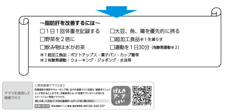 健康 脂肪肝の原因になる食べ物は「脂肪」よりも「糖」! 9/30 前の記事 次の記事 発行日 : 2026年02月01日 自治体名 : 熊本県和水町 広報紙名 : 広報なごみ 2026年2月号 日々体内に入る糖質が多いと、余分な「糖」は「脂肪」肝臓は我慢強い「沈黙の臓器」です。 数値を知り、早めの対策が安心☺ 問合せ:保健子ども課 保健予防係 【電話】0968・86・5730 Tweet シェアする 和水町と山鹿市との共同で「巡回スマホ教室」開催中!! 日本遺産の日 菊池川流域 日本遺産パネル展開催のお 知らせ