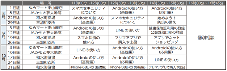 移動型の「巡回スマホ教室」を開催しています。和水町と山鹿市が指定した場所にスマホ教室の車がやってきます。この機会にスマホの操作方法やスマホの気になること、聞いてみませんか?個別相談ではマイナンバーカードの申請もできます。ぜひご活用ください!
