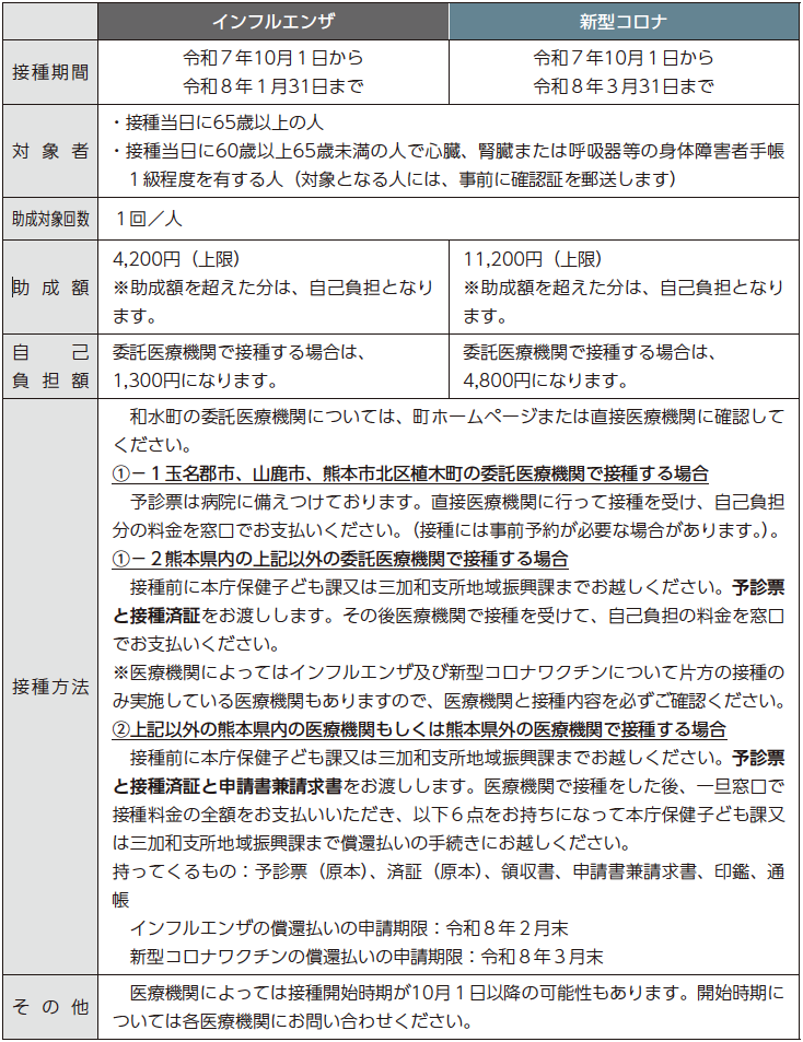 健康 高齢者のインフルエンザ及び新型コロナワクチン 10月1日より接種を開始します 11/38 前の記事 次の記事 発行日 : 2025年10月01日 自治体名 : 熊本県和水町 広報紙名 : 広報なごみ 2025年10月号 和水町では集団感染や重症化を防ぐため、高齢者のインフルエンザ及び新型コロナワクチンの予防接種費用の一部を助成します。 問合せ:保健子ども課 保健予防係 【電話】0968・86・5730 Tweet シェアする 令和8年度の放課後児童クラブ(学童)の利用申請のご案内 子どもインフルエンザ予防接種の費用助成を行います