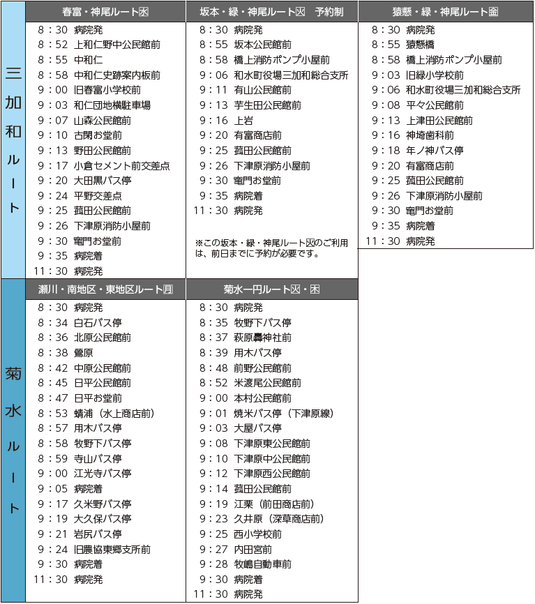 基本的に予約は、不要ですが、三加和ルートの「坂本・緑・神尾ルート(火)」は、前日までに予約が必要です。