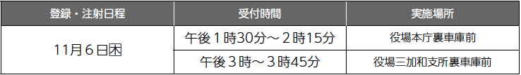 秋の狂犬病予防集合注射を以下の日程で実施しますので、未接種の飼い犬は、必ず接種をお願いします。(犬の登録も受け付けます。)