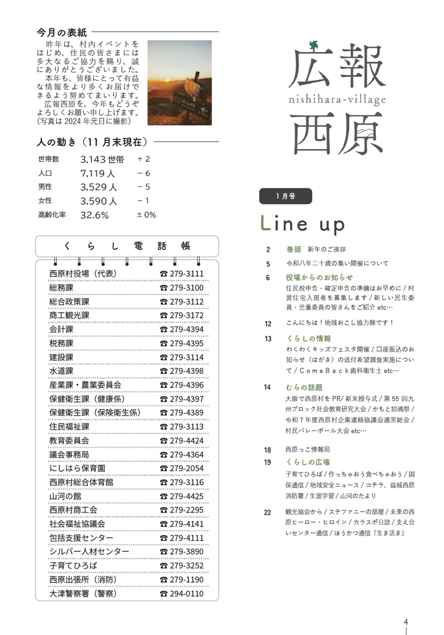 くらし 広報西原 令和8年1月号 P.4 3/27 前の記事 次の記事 発行日 : 2026年01月07日 自治体名 : 熊本県西原村 広報紙名 : 広報西原 令和8年1月号 Tweet シェアする 広報西原 令和8年1月号 P.2-3 広報西原 令和8年1月号 P.5