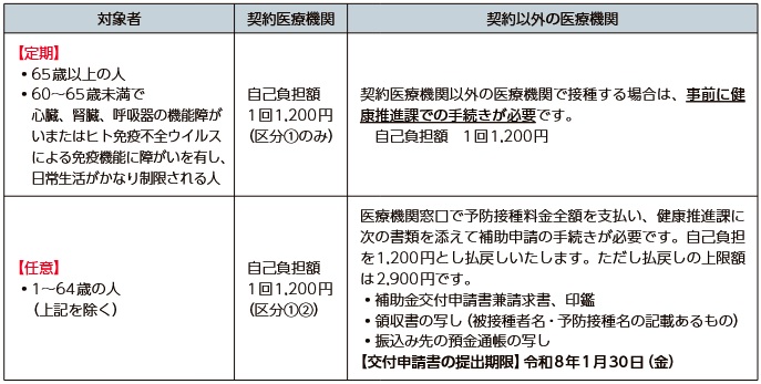 ・生活保護世帯の人は、別途助成があります。接種前に健康推進課にお問い合わせください。