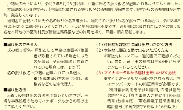 くらし 戸籍に振り仮名が記載されます 12/31 前の記事 次の記事 発行日 : 2025年09月30日 自治体名 : 熊本県南阿蘇村 広報紙名 : 広報みなみあそ 令和7年10月号 Tweet シェアする Hot News 南阿蘇村の話題(1) くらしの告知板 Life Information