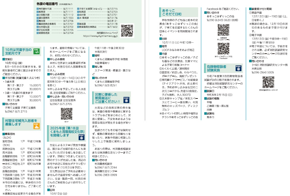 くらし くらしの告知板 Life Information 13/31 前の記事 次の記事 発行日 : 2025年09月30日 自治体名 : 熊本県南阿蘇村 広報紙名 : 広報みなみあそ 令和7年10月号 Tweet シェアする 戸籍に振り仮名が記載されます 阿蘇立野ダム展望施設タテットを拠点としたモニターツアーの参加者募集