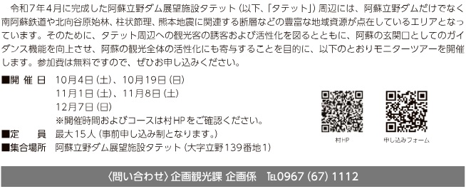 くらし 阿蘇立野ダム展望施設タテットを拠点としたモニターツアーの参加者募集 14/31 前の記事 次の記事 発行日 : 2025年09月30日 自治体名 : 熊本県南阿蘇村 広報紙名 : 広報みなみあそ 令和7年10月号 Tweet シェアする くらしの告知板 Life Information えづけSTOP! -地域ぐるみの「環境づくり」- ~鳥獣被害対策 Vol.7~