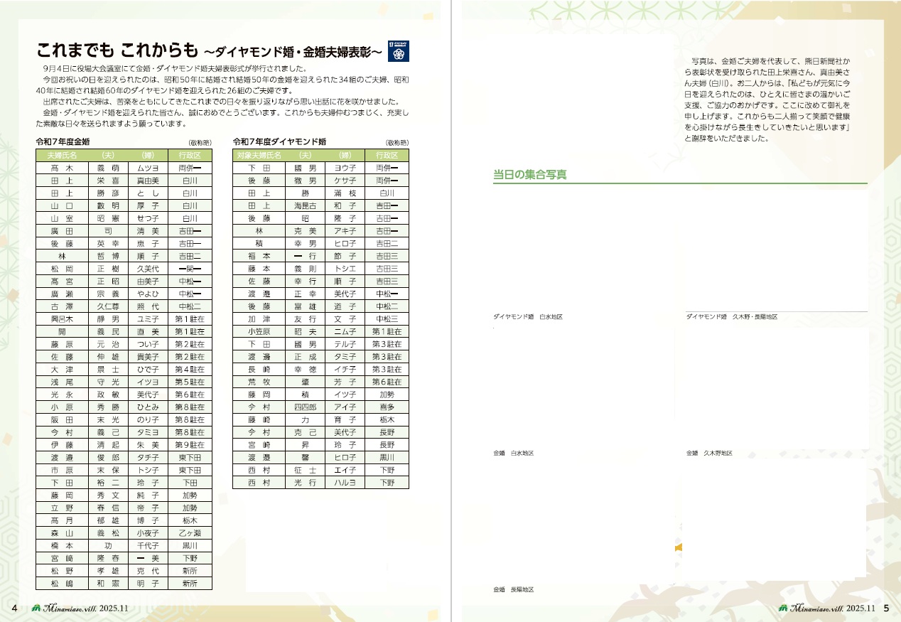 くらし これまでも これからも~ダイヤモンド婚・金婚夫婦表彰~ 2/32 前の記事 次の記事 発行日 : 2025年10月30日 自治体名 : 熊本県南阿蘇村 広報紙名 : 広報みなみあそ 令和7年11月号 Tweet シェアする 第2回南阿蘇村未来会議 村の未来をみんなで創る! 南阿蘇中学生職場体験だより