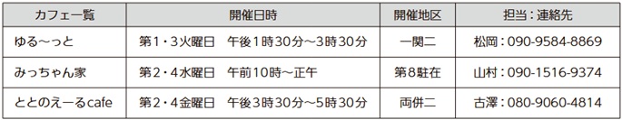 オレンジカフェは、認知症の人やその家族、地域住民、介護や福祉などの専門家など、だれでも、気軽に集える場所です。参加は自由で、ちょっとお茶を飲んで帰ることもできます。介護ストレスの軽減の場だけではなく、あらたな出会い、地域とのつながりの場です。ぜひ一度、気軽に参加してみませんか。