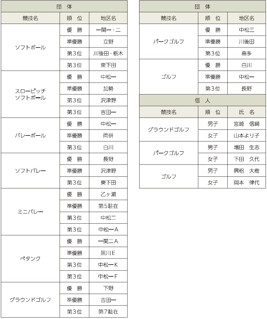 今年も、全9競技に各地区を代表した選手の皆さんが出場。各会場で白熱した戦いを繰り広げ、にぎやかな雰囲気の中、爽やかな汗を流していました。各競技の結果は表のとおりです。