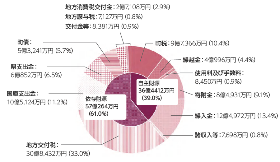 一方、地方交付税や国や県からの補助金、特定の事業に充てることができる町債(借金)など、国や県により定められたり、割り当てられたりする収入(依存財源)の合計は、57億264万円となっており、歳入の61%を占めています。