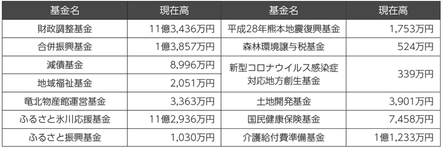 基金とは、不測の事態への対応や特定の目的のために積み立てられた町の預金です。右のページのように一般会計と特別会計を併せて13種類の基金があり、子ども医療費や行政区活動活性化交付金、防災備蓄品の購入などに基金から繰入金を充てています。