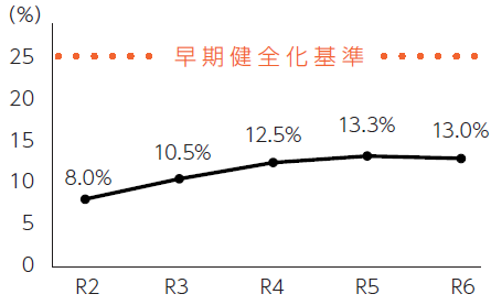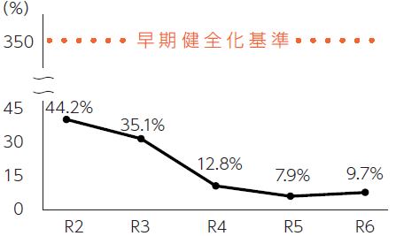 財政状況が黄色信号となっていることを示す基準値。指標のうち1つでもこの基準を超えると、町は自主的に財政再建に取り組まなければなりません。