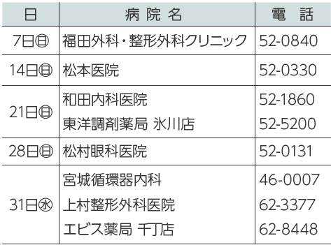 くらし 休日当番医・薬局(市外局番0965) 31/35 前の記事 次の記事 発行日 : 2025年11月30日 自治体名 : 熊本県氷川町 広報紙名 : 広報ひかわ 2025年12月号 最新情報は「医療情報ネット(ナビィ)」 本紙を参照ください 年末の診療状況については「医療情報ネット」でご確認ください。 Tweet シェアする 乳幼児健診情報 令和7年(2025年)12月カレンダー