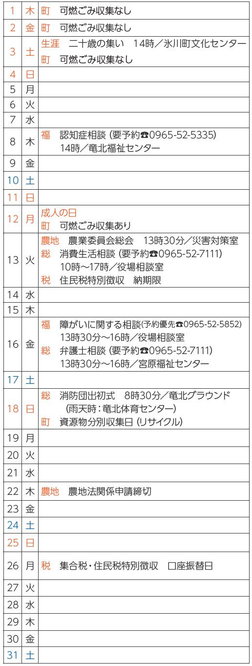 くらし 令和8年(2026年)1月カレンダー 38/41 前の記事 次の記事 発行日 : 2025年12月26日 自治体名 : 熊本県氷川町 広報紙名 : 広報ひかわ 2026年1月号 Tweet シェアする 休日当番医・薬局(市外局番0965) 第21回氷川まつり前夜祭 出演者募集