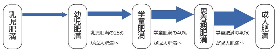 肥満の子どもは、その後成人肥満に移行しやすいです。(図1)。また、子どもの肥満も大人同様に糖尿病や高血圧などの生活習慣病を発症する可能性が高くなります。そのため子どもの頃からの肥満予防が大事になります。