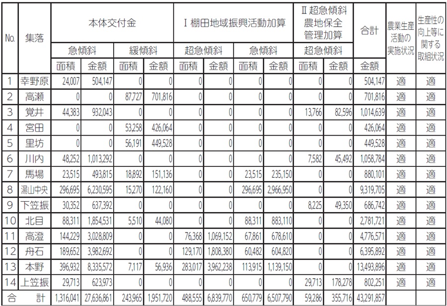 令和6年度(2024年度)では、農地の維持・保全を目的とした第5期中山間地域等直接支払制度が本村でも実施されています。