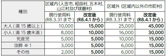 人吉葬斎場の葬斎場使用料金を改定することとなりましたのでお知らせいたします。これまで葬斎場の使用料金は供用開始から見直すことなく運営してまいりましたが、昨今の物価上昇や人件費の高騰に伴い、葬斎場使用料金を改定するものです。令和8年4月1日火葬分から新料金体系が適用されます。
