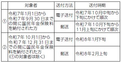 日本年金機構から下記のスケジュールで「社会保険料(国民年金保険料)控除証明書」が対象者宛てに送付されますので、お手元に届きましたら、保管し年末調整や確定申告の際に使用してください。