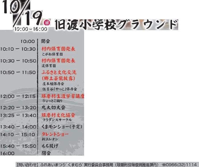 イベント 第41回 ふれあいまつり くまむら 29/30 前の記事 次の記事 発行日 : 2025年09月25日 自治体名 : 熊本県球磨村 広報紙名 : 広報くまむら 2025年10月号 Tweet シェアする 10月 行事予定・やまびこ号運行表 その他のお知らせ (広報くまむら 2025年10月号)