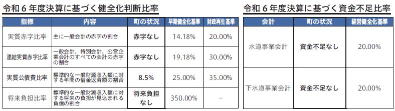 令和6年度の健全化判断比率は、早期健全化基準を上回るものはなく、財政指標もおおむね良好な数値を示しており、健全性は維持されています。