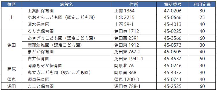 ※延長保育、一時預かり、障がい児保育などの子育て支援事業については、各園へ直接問い合わせください。