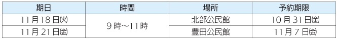期日・時間・場所・予約期限: